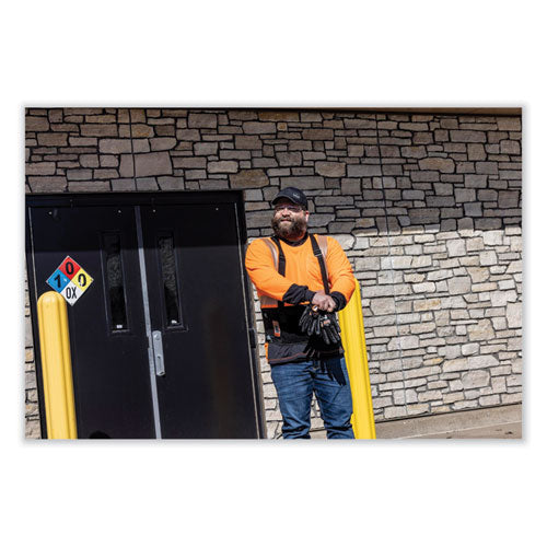 Class 2 black front performance T-shirt made of lightweight birdseye knit paired with 3M Scotchlite Comfort Trim. Moisture wicking treatment and armpit vents keep the user cool and dry. 30+ UPF for protection against harmful UV. An outside chest pocket to keep small items accessible. Black front, sleeves and collar hide dirt and wear.