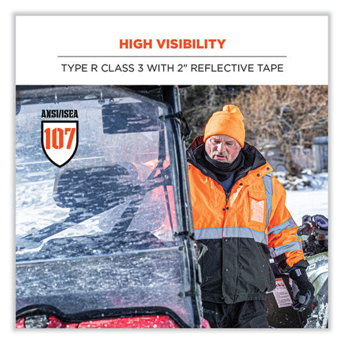 The GloWear 8381 is a Type R Class 3, 4-in-1 Hi-Vis Jacket that can be worn multiple ways for ultimate adaptability in changing weather. Zip out the liner to wear it alone as a lightweight fleece jacket, zip off liner sleeves for wear as a vest, wear the shell on its own as a lightweight weatherproof layer or leave the liner zipped in to wear as a warm winter work jacket. Ultra-warm 280 g fleece traps heat for warmth in extreme cold, while a weatherproof 300D performance polyester shell with PU coating resists water and wind without compromising comfort or breathability. Built for long-lasting durability, this hi-vis jacket features a ripstop shell and dirt-hiding black panels. Compliant to ANSI/ISEA 107, Type R Class 3 with 2" reflective tape for enhanced low-light visibility.