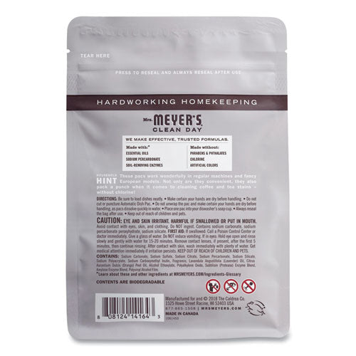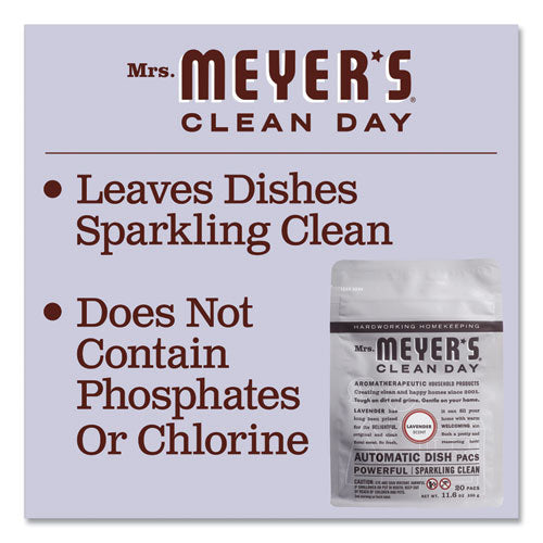 Mrs. Meyer's Clean Day automatic dish packets help your dishwasher produce sparkling dishes, glasses and flatware. Each pack of oxygen bleach formula loads easily in the dishwasher's soap cup and is safe for use in all machines. Clean coffee stains from cups without phosphates or chlorine.