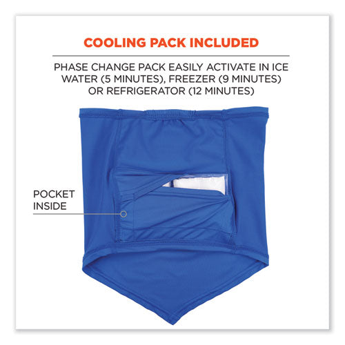 The Chill-Its 6482 Cooling Neck Gaiter with Pocket protects workers from sun, dust and debris while also providing cool relief on hot days. When wet, the evaporative cooling technology will instantly activate for hours of cooling. When dry, the material will absorb sweat and wick moisture. For advanced cooling along the neck, this neck gaiter features a reinforced back pocket designed to hold the Chill-Its 6283 Rechargeable Phase Change Ice Pack (included). It is rated to UPF 50+ for protection against the sun's harmful UV rays, and also features a reflective accent for enhanced visibility. With a bandana cut, this gaiter is longer in the front than back. When pulled up for wear as a face covering, the adjustable nose clip along the top makes for a comfortable and secure fit while also reducing eyewear fogging. A gathered elastic seam along the back reduces the gap between the neck and gaiter for a snug, comfortable fit.
