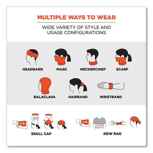 The Chill-Its 6485 Multi-Band offers head and face protection from the sun, dust and flying debris. Plus, it features moisture-wicking technology to absorb sweat and wick moisture away. This multi-band features supremely versatile performance fabric with a multitude of uses and ways to wear. This PPE safety headwear is incredibly versatile. The soft, stretchable knit material allows the multi-band to be worn as a cooling headband, neck gaiter, face mask or face covering, hat, dew rag and more. It can also be worn under a hard hat to wick moisture on hot days. Anti-Odor treatment keeps it fresh all day long. Hang dry or machine wash as needed. Great for construction, landscaping, roofing, or anybody working in the heat. It can also be used to keep cool and reduce the risk of heat stress while gardening, hiking, playing sports and more.
