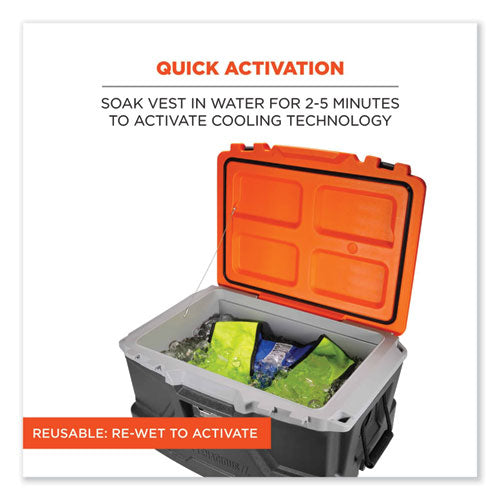 The Chill-Its 6665 Evaporative Cooling Vest is made with an advanced polymer-embedded fabric to provide workers with immediate core cooling relief from the heat. This lightweight cooling vest is made of comfortable and durable quilted nylon exterior with mesh side panels for ventilation and stretch. Wear this body cooling vest over a t-shirt. A water-repellant liner keeps the interior of the vest as dry as possible when activated, though wearers should expect to feel some dampness/wetness. Evaporative cooling technologies such as embedded polymers are a simple, effective and comfortable solution for heat stress prevention. Similar to how sweat cools the body, evaporative technologies use an external water source to draw heat away helping to regulate body temperature while providing cool relief. In order to activate, soak in water for two to five minutes. The embedded polymers will retain water for up to four hours of cooling relief. Hand wash as needed and hang to dry.