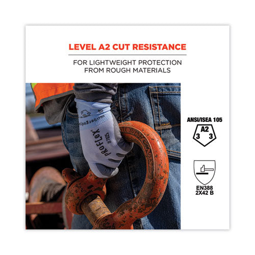 The ProFlex 7025 PU Coated Cut-Resistant Gloves feature ANSI A2 cut protection for safety around sharp materials. Unlike other bulky cut-resistant gloves, the 18-gauge HPPE nylon-spandex knit protects hands while maintaining a soft, lightweight and flexible form fit. The snug knit cuffs are longer than most on the market, a feature that enhances fit and extends protection while keeping dirt and debris out. The palms of these safety gloves are dipped in PU (polyurethane), a strong but flexible coating that delivers secure grip with enhanced dexterity on a variety of surfaces. The 18-gauge seamless HPPE nylon-spandex knit is tested to ANSI A2 cut protection and level 3 abrasion resistance for safety around sharp or rough materials.