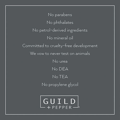 Carefully crafted with high-quality ingredients and essential oils. Guild+Pepper® represents the perfect alchemy of past and present, a thoroughly modern throwback designed to intrigue. The formula utilizes invigorating and rich emollients of Quercus bark, Irish moss, and Calluna (heather) extracts to cleanse hair, leaving it strong and manageable. Designed to create a sensory experience.
