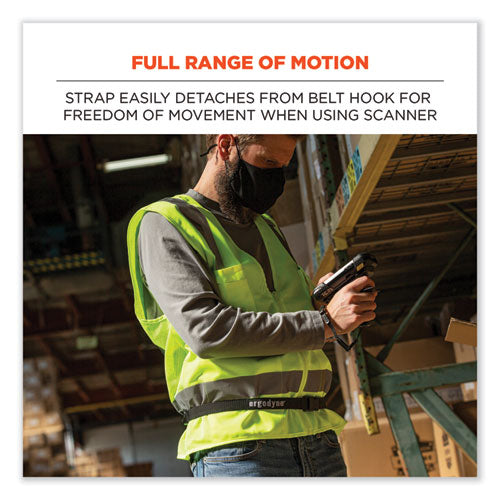 The Squids 3135 Barcode Scanner Belt with Hook is designed for use with Squids 3136 Barcode Scanner Adaptor Straps (one included) to keep barcode and QR scanners secure and accessible during warehouse and distribution work. This industrial-grade scanner belt is built with a heavy-duty webbing strap and ultra-durable buckles that withstand the harshest environmental conditions. Simply thread a scanner adaptor strap through the small captive hole built into most cordless scanners, and then hang the adapter strap on the belt's handy hook to keep your scanner secured to your hip, at the ready. Modular format allows the user to easily switch out scanners for any equipped with a Squids 3136 Adaptor Strap (additional straps sold separately). Curved cinch-buckle fits comfortably against the wearer's waist for all-day wearing comfort. Hand wash with mild soap and water and then air dry.