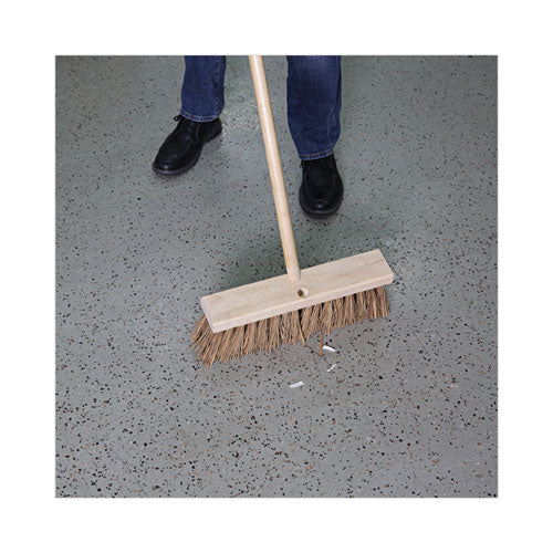 Long, coarse bristled brush head effectively pushes litter and debris with ease to clean more efficiently. Built with one tapered and one threaded handle hole that enable front-to-back orientation changes for more even wear. For use with threaded 1.13-inch diameter handles, which are sold separately. 16” wide hardwood block brush for maximum coverage and durability.Ideal for hard, floor surfaces, indoors or outdoors.