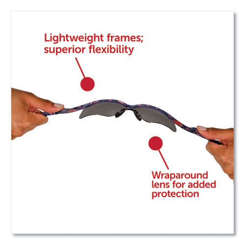 Feature sleek, flexible, lightweight design with soft touch temples for comfort. Patented nose piece designed to be extremely flexible, to channel sweat away from the eyes, and to help prevent slippage down the nose—all for long-term comfort. Scratch-resistant dual polycarbonate lens offers 99% UVA/UVB/UVC protection.
