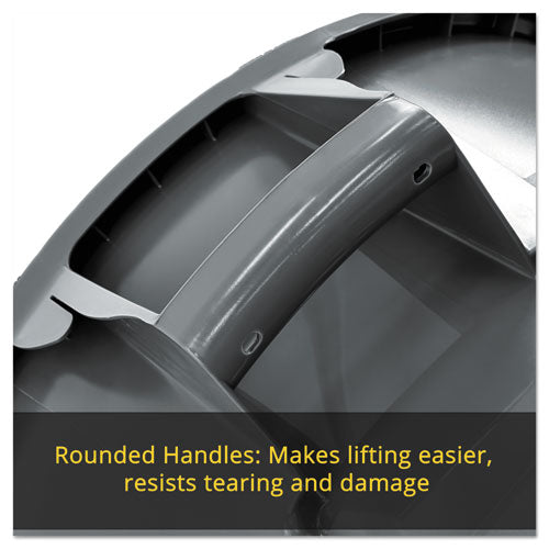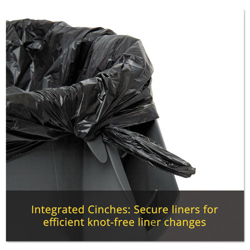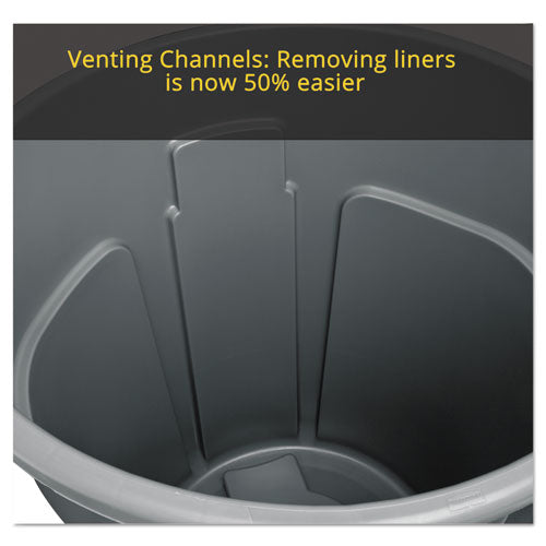 Sets the standard for reliable garbage collection in high traffic areas. Built tough and versatile, these garbage cans feature revolutionary venting channels that let air flow into the receptacle making liners up to 50% easier to remove. Integrated cinches allow bags to be attached to handles without knots for faster liner changes while contoured base handles and rounded top handles make it easier for staff to lift and transport these receptacles in any facility. Constructed of the high-quality materials, these crush-resistant garbage cans have heavy-duty, reinforced bases that hold up even when dragged across rough surfaces. These trash cans are stackable to save space and provide an unbeatable value with their easy-to-clean, seamless construction, UV inhibitor, and do not fade, warp, crack or crush.